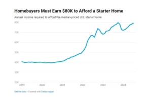 Redfin, Seattle, found homebuyers need to earn $79,252 annually to afford the median-priced starter home, only about $500 below the all-time high notched in October 2023 and up 4.4% year-over-year.