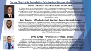 The Sarma Charitable Foundation (SCF) is excited to announce the lineup for its annual flagship event! UTSA’s Men’s Basketball dynamic duo of Head Coach Austin Claunch, and Assistant Coach Joey Brooks will be speaking at our event. Hosted by Ernie Zuniga former San Antonio news anchor and now talk show host of “Pickup Lines.”